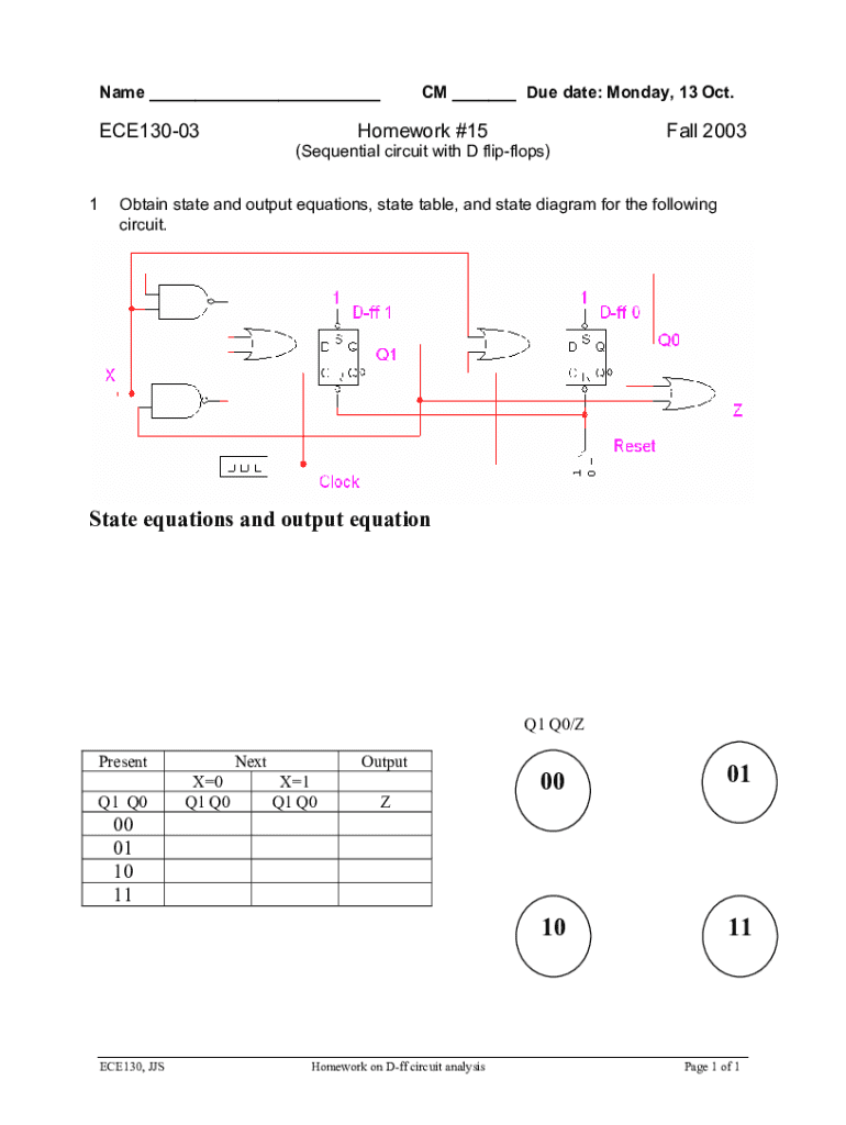 Name ___ECE13003CM ___ Due date: Monday, 13 Oct.Homework #15Fall 2003(Sequential circuit with D flipflops) 1Obtain state and output equations, state table, and state diagram for the following circuit.State