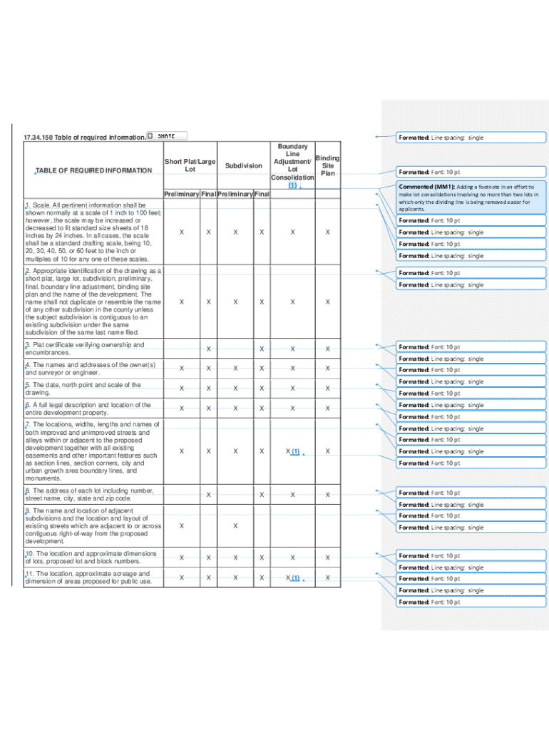 Formatted: Line spacing: single17.34.150 Table of required information.TABLE OF REQUIRED INFORMATIONShort Plat/Large LotSubdivisionBoundary Line Binding Adjustment/ Site Lot Plan Consolidation (1)Preliminary