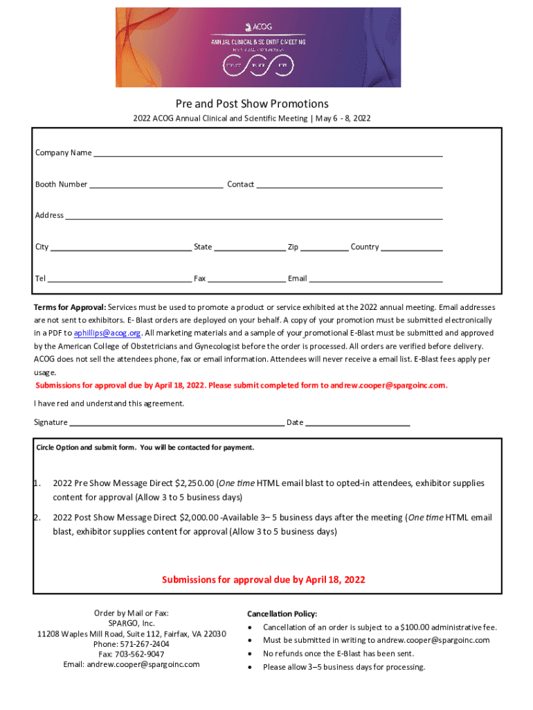 This document outlines the promotional services available for exhibitors at the 2022 ACOG Annual Clinical and Scientific Meeting, including terms for approval, pricing for pre and post show email blasts, submission guidelines, and cancellation policies.