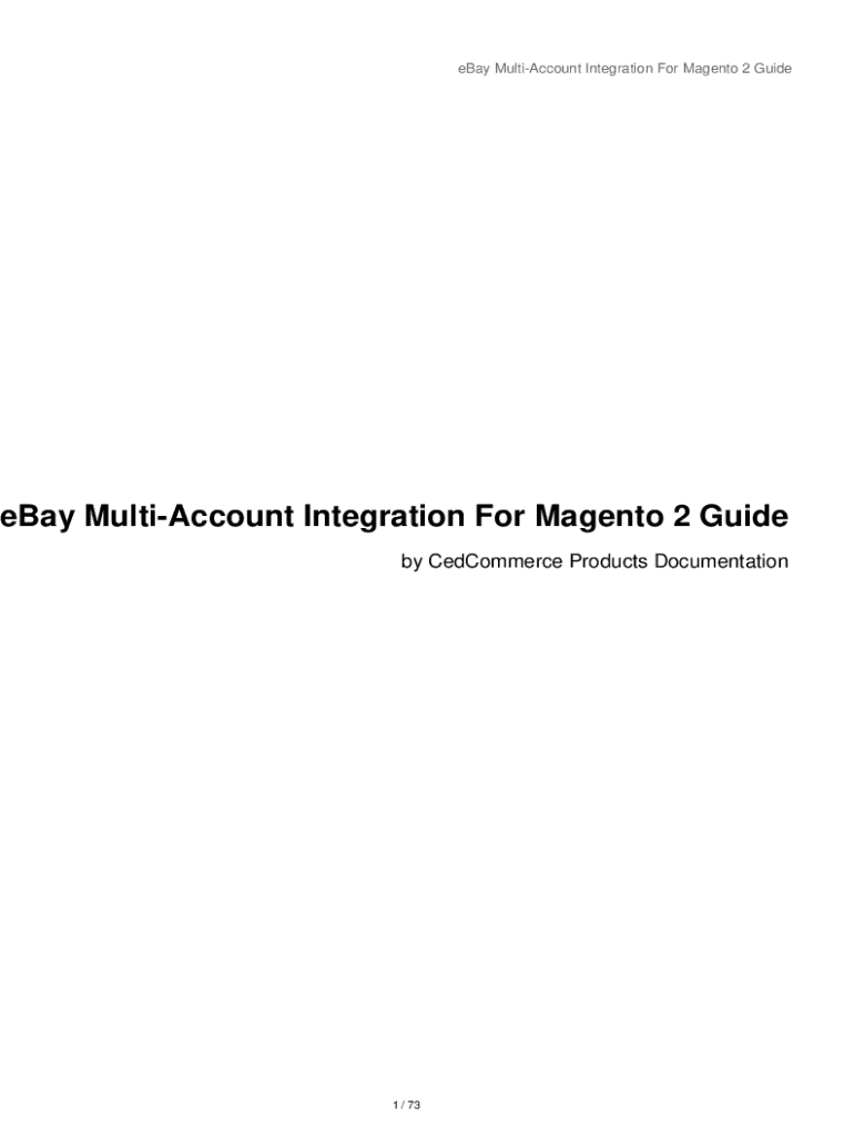 This guide provides comprehensive instructions for eBay Multi-Account Integration with Magento 2, including installation, account management, product management, and configuration settings to enable seamless listing and selling of products across multiple eBay accounts.