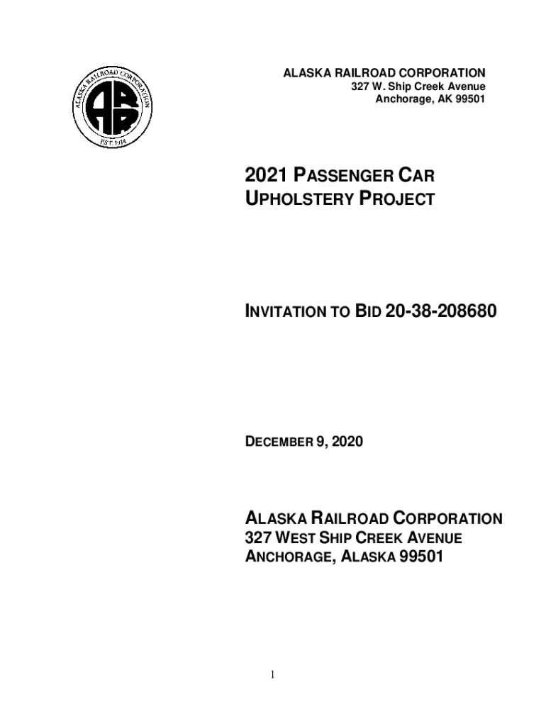 This document serves as an invitation for bids regarding the 2021 Passenger Car Upholstery Project by the Alaska Railroad Corporation, detailing the requirements, scope of work, and terms for contractors interested in participating in the project.