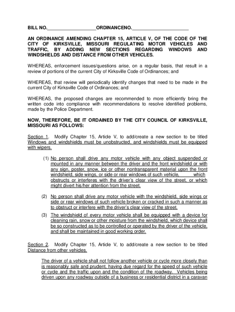 BILL NO.___ORDINANCENO.___ AN ORDINANCE AMENDING CHAPTER 15, ARTICLE V, OF THE CODE OF THE CITY OF KIRKSVILLE, MISSOURI REGULATING MOTOR VEHICLES AND TRAFFIC, BY ADDING NEW SECTIONS REGARDING WINDOWS