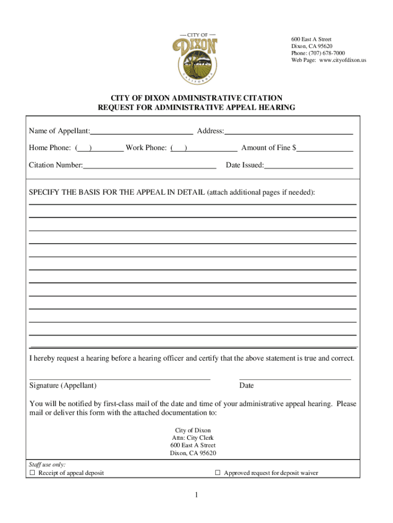 600 East A Street Dixon, CA 95620 Phone: (707) 6787000 Web Page: www.cityofdixon.usCITY OF DIXON ADMINISTRATIVE CITATION REQUEST FOR ADMINISTRATIVE APPEAL HEARING Name of Appellant: Home Phone: ()Address: