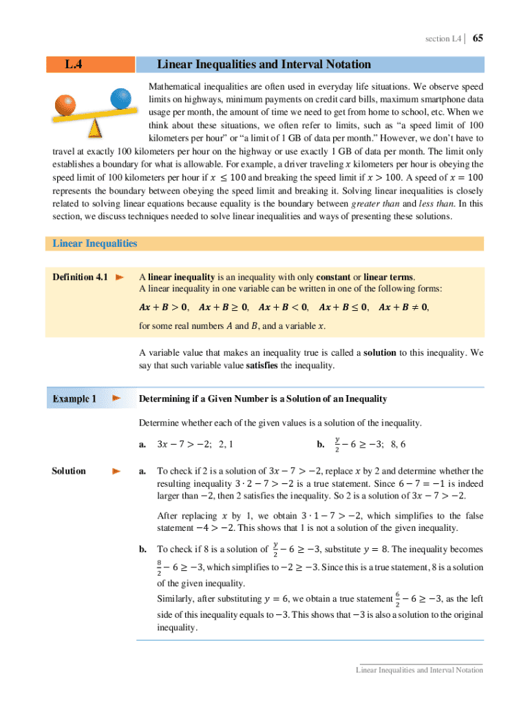 section L4 |L.465Linear Inequalities and Interval NotationMathematical inequalities are often used in everyday life situations. We observe speed limits on highways, minimum payments on credit card