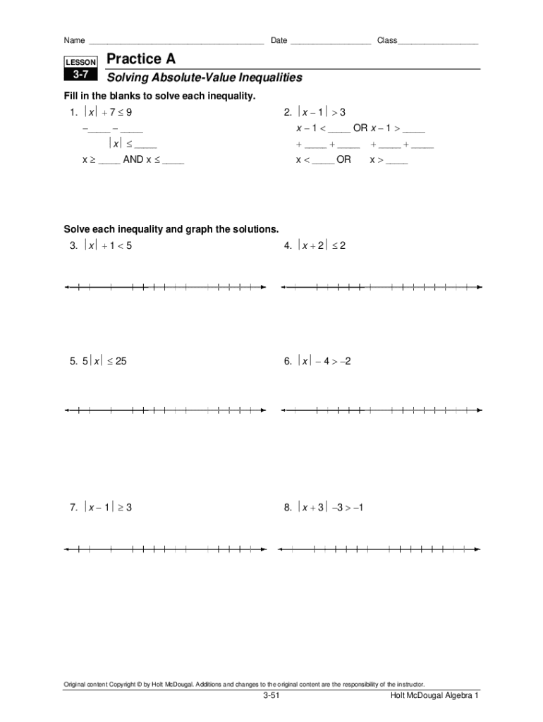 Name ___ Date ___ Class ___ LESSON37Practice A Solving AbsoluteValue InequalitiesFill in the blanks to solve each inequality. 1. x 7 92. x 1 3___ ___x 1 ___ OR x 1 ___x ___ x ___ AND x ___ ___ ___
