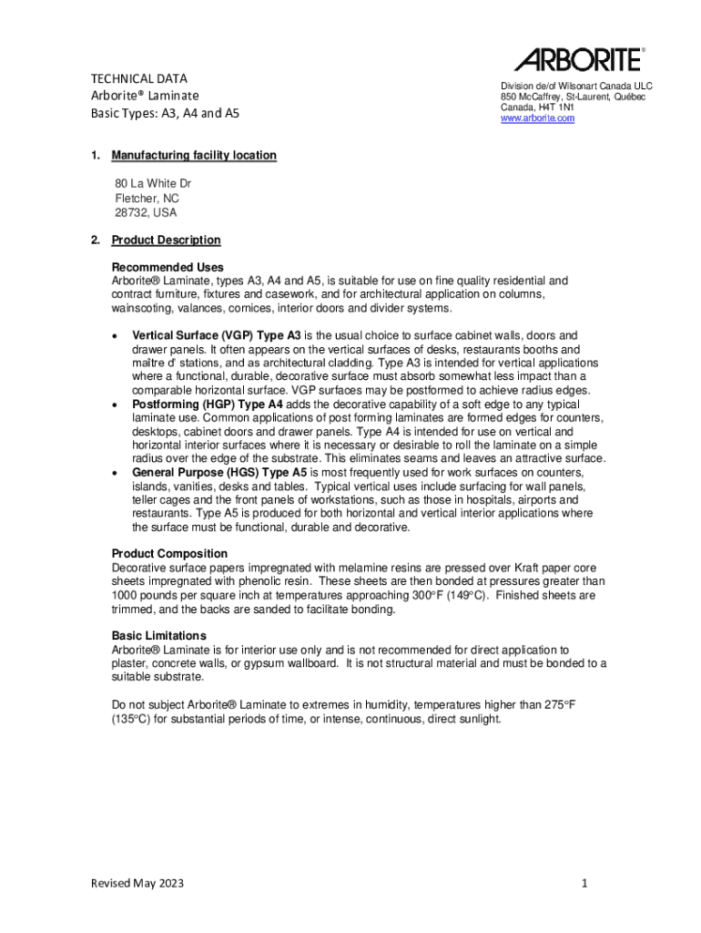 TECHNICAL DATA Arborite Laminate Basic Types: A3, A4 and A5Division de/of Wilsonart Canada ULC 850 McCaffrey, StLaurent, Qubec Canada, H4T 1N1 www.arborite.com1. Manufacturing facility location 80