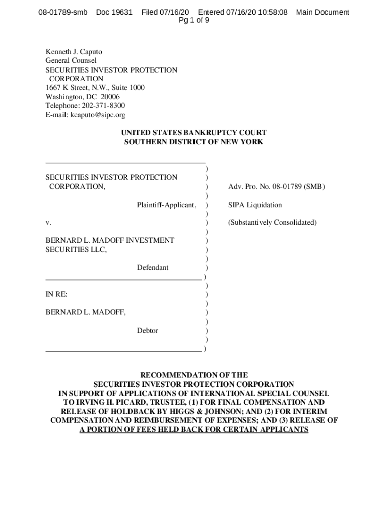 This document is a recommendation from the Securities Investor Protection Corporation (SIPC) regarding the applications for interim and final compensation submitted by international special counsels representing the Trustee in the liquidation proceedings of Bernard L. Madoff Investment Securities LLC. It outlines the details of compensation applications, the services rendered by the counsels, and the SIPC\'s support for these applications in the context of SIPA regulations.