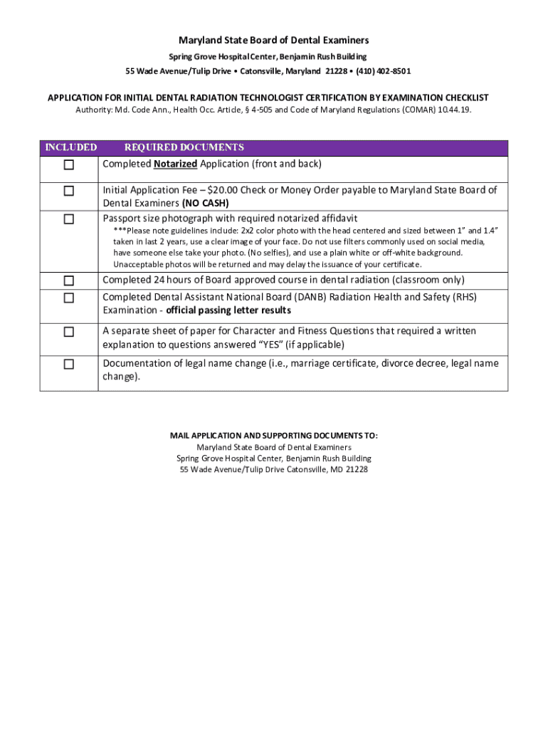 Maryland State Board of Dental Examiners Spring Grove Hospital Center, Benjamin Rush Building 55 Wade Avenue/Tulip Drive Catonsville, Maryland 21228 (410) 4028501APPLICATION FOR INITIAL DENTAL RADIATION
