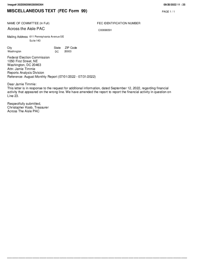 This document is a response letter from Across the Aisle PAC to the Federal Election Commission regarding a request for additional information about financial activity reported incorrectly in their August Monthly Report.