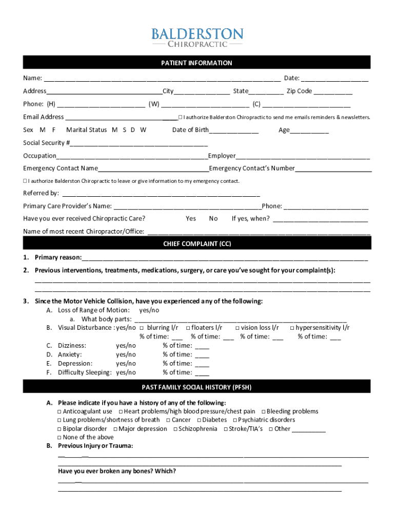 PATIENT INFORMATION Name: ___ Date: ___ AddressCity___ State___ Zip Code ___Phone: (H) ___ (W) ___ (C) ___ ___ I authorize Balderston Chiropractic to send me emails reminders & newsletters.Email Address