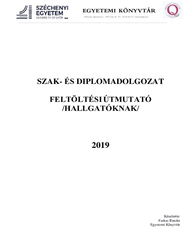 EGYETEMI KNYVTR 9026 Gyr, Egyetem tr 1. / 9007 Gyr, Pf.: 701 / +36 96 503 441 / konyvtar@sze.huSZAK S DIPLOMADOLGOZAT FELTLTSI TMUTAT /HALLGATKNAK/2019Ksztette: Farkas Renta Egyetemi KnyvtrTartalom