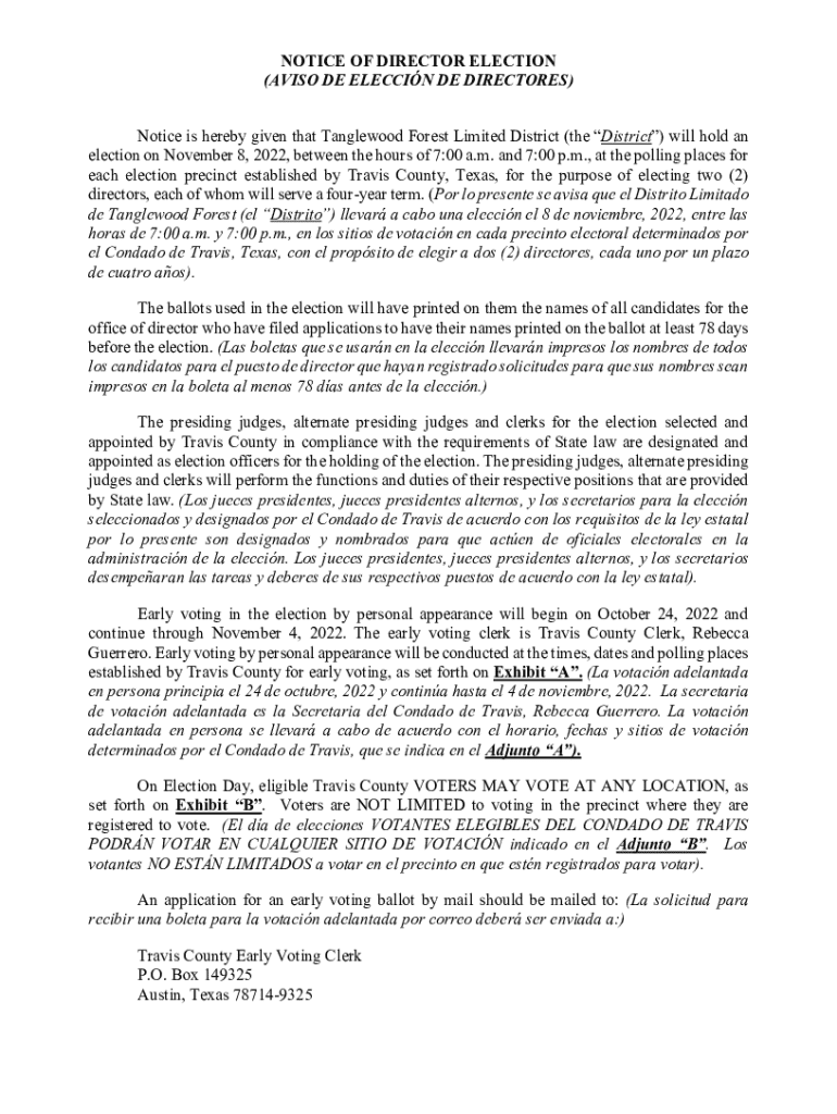 This document serves as an official notice for the upcoming director election for Tanglewood Forest Limited District, scheduled for November 8, 2022. It provides details about the election time, location, early voting, and the process for receiving ballots by mail.