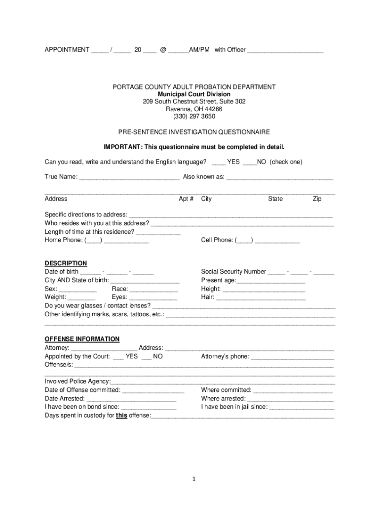 APPOINTMENT ___ / ___ 20 ___ @ ___AM/PM with Officer ___PORTAGE COUNTY ADULT PROBATION DEPARTMENT Municipal Court Division 209 South Chestnut Street, Suite 302 Ravenna, OH 44266 (330) 297 3650 PRESENTENCE