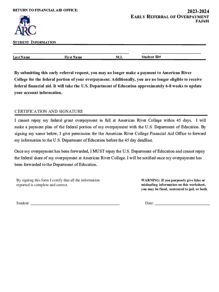 RETURN TO FINANCIAL AID OFFICE:20232024EARLY REFERRAL OF OVERPAYMENTFAJA81STUDENT INFORMATION ______Last NameStudent ID#First NameM.I.By submitting this early referral request, you may no longer make