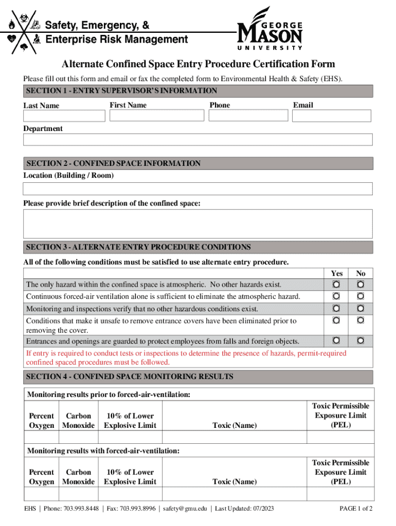 Alternate Confined Space Entry Procedure Certification Form Please fill out this form and email or fax the completed form to Environmental Health & Safety (EHS). SECTION 1 ENTRY SUPERVISORS INFORMATION