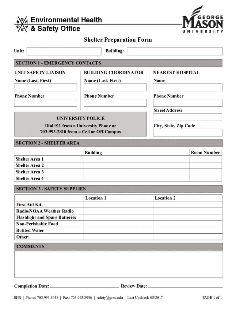 Environmental Health & Safety Office Shelter Preparation Form Unit:Building:SECTION 1 EMERGENCY CONTACTS UNIT SAFETY LIAISONBUILDING COORDINATORNEAREST HOSPITALName (Last, First)Name (Last, First)NamePhone