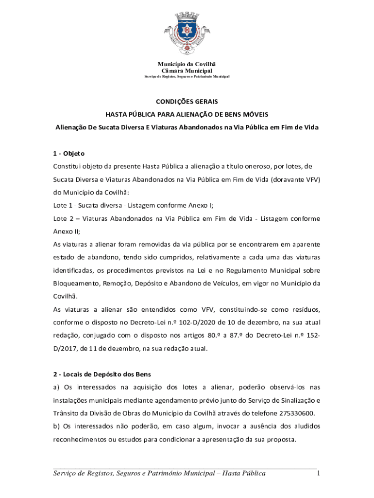 Municpio da Covilh Cmara Municipal Servio de Registos, Seguros e Patrimnio MunicipalCONDIES GERAIS HASTA PBLICA PARA ALIENAO DE BENS MVEIS Alienao De Sucata Diversa E Viaturas Abandonados na Via Pblica