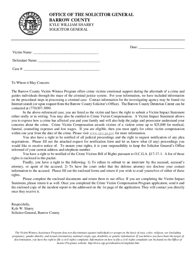 OFFICE OF THE SOLICITOR GENERAL BARROW COUNTY KYLE WILLIAM SHARRY SOLICITOR GENERALDate: ___ Victim Name: ___ Defendant Name: ___ Case #: ___To Whom it May Concern: The Barrow County Victim Witness