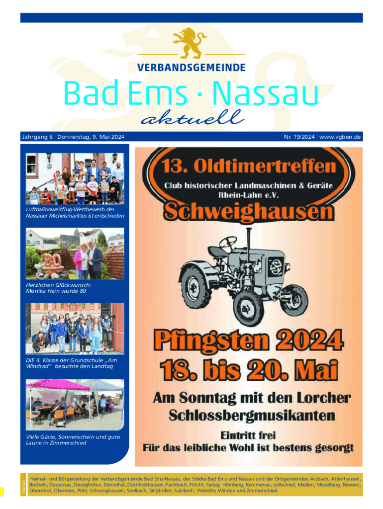 aktuell Jahrgang 6 Donnerstag, 9. Mai 2024Nr. 19/2024 www.vgben.deLuftballonweitflugWettbewerb des Nassauer Michelsmarktes ist entschiedenHerzlichen Glckwunsch: Monika Hein wurde 80DIE 4. Klasse der
