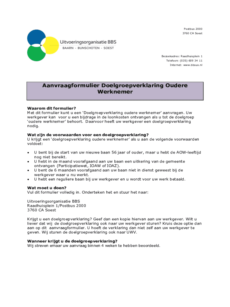 Postbus 2000 3760 CA SoestBezoekadres: Raadhuisplein 1 Telefoon: (035) 609 34 11 Internet: www.bbsuo.nlAanvraagformulier Doelgroepverklaring Oudere Werknemer Waarom dit formulier? Met dit formulier