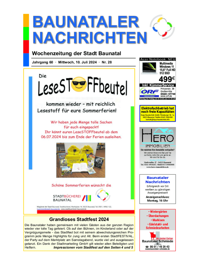 Wochenzeitung der Stadt Baunatal Jahrgang 60 Mittwoch, 10. Juli 2024 Nr. 28Elektrofachbetrieb hat noch freie KapazittenKopp Haustechnik GmbH, Flensburger Str. 1a, 34225 Baunatal, Telefon 05601 9696900
