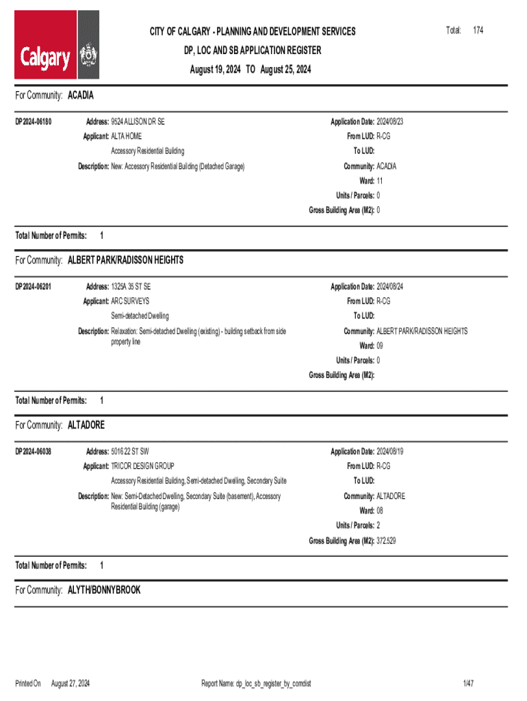Total:CITY OF CALGARY PLANNING AND DEVELOPMENT SERVICES174DP, LOC AND SB APPLICATION REGISTER August 19, 2024 TO August 25, 2024 For Community: ACADIA DP202406180Address: 9524 ALLISON DR SEApplication