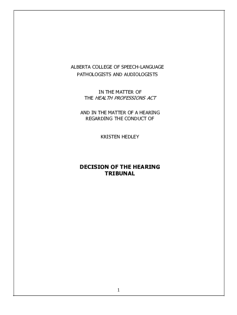 ALBERTA COLLEGE OF SPEECHLANGUAGE PATHOLOGISTS AND AUDIOLOGISTS IN THE MATTER OFTHE HEALTH PROFESSIONS ACT AND IN THE MATTER OF A HEARING REGARDING THE CONDUCT OF KRISTEN HEDLEYDECISION OF THE HEARING