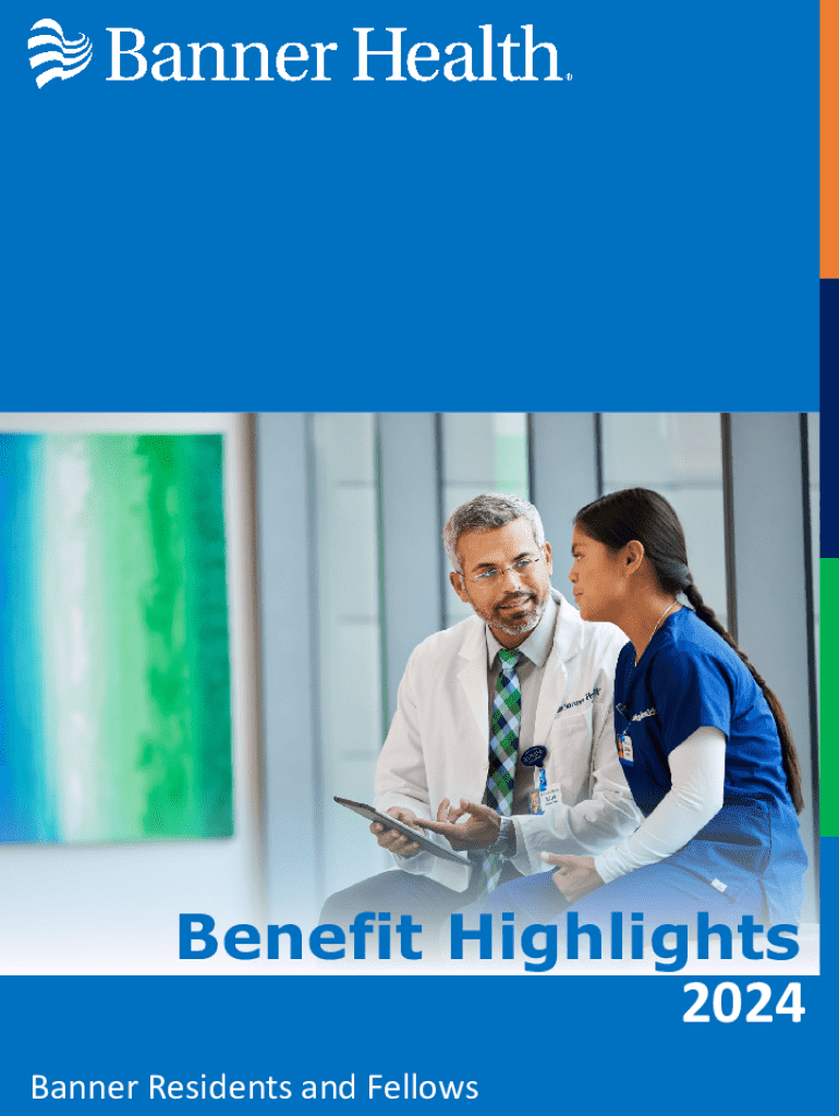 This document provides a comprehensive overview of the benefits available to residents and fellows at Banner Health for the year 2024, including eligibility, medical, dental, vision, life insurance, wellness programs, and additional benefits. It aims to empower team members by emphasizing well-being and affordability in their benefit options.