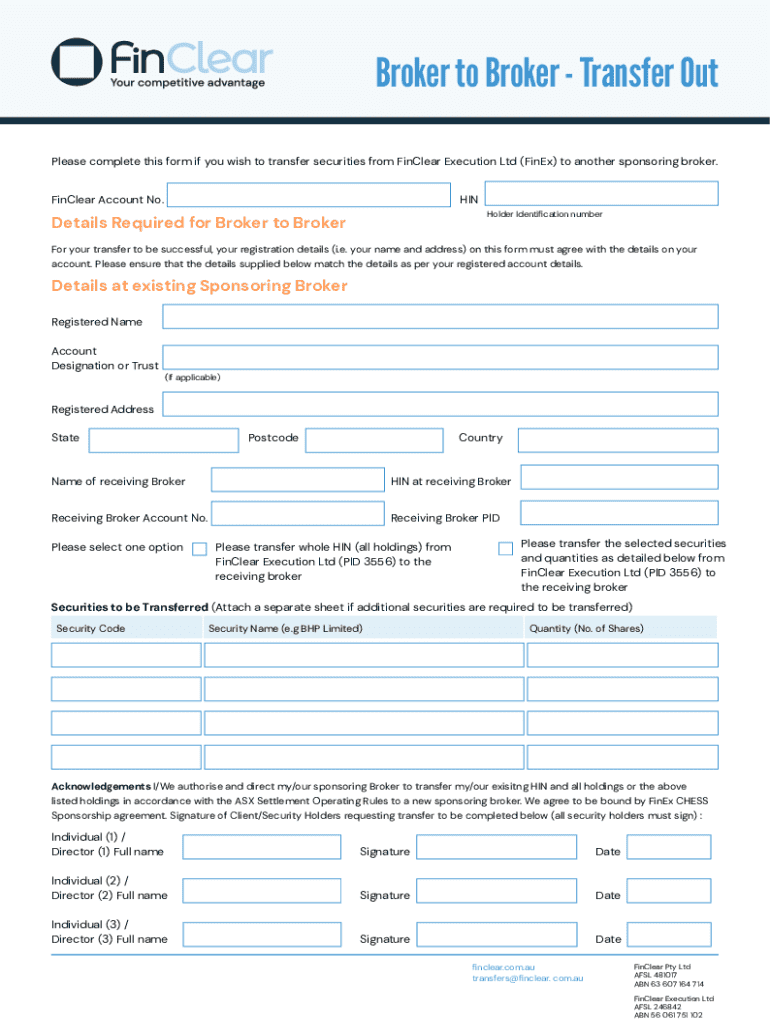 Broker to Broker Transfer Out Please complete this form if you wish to transfer securities from FinClear Execution Ltd (FinEx) to another sponsoring broker. FinClear Account No.HIN Holder Identification
