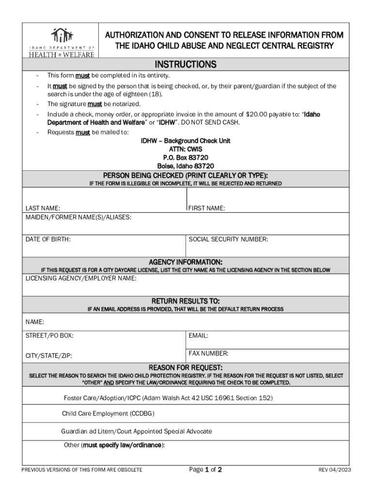 This document serves as an authorization form for employees working with children to request a background screening from the Idaho Child Abuse and Neglect Central Registry. It details the required information to be completed, payment instructions, and the legal implications of the results obtained from this screening.