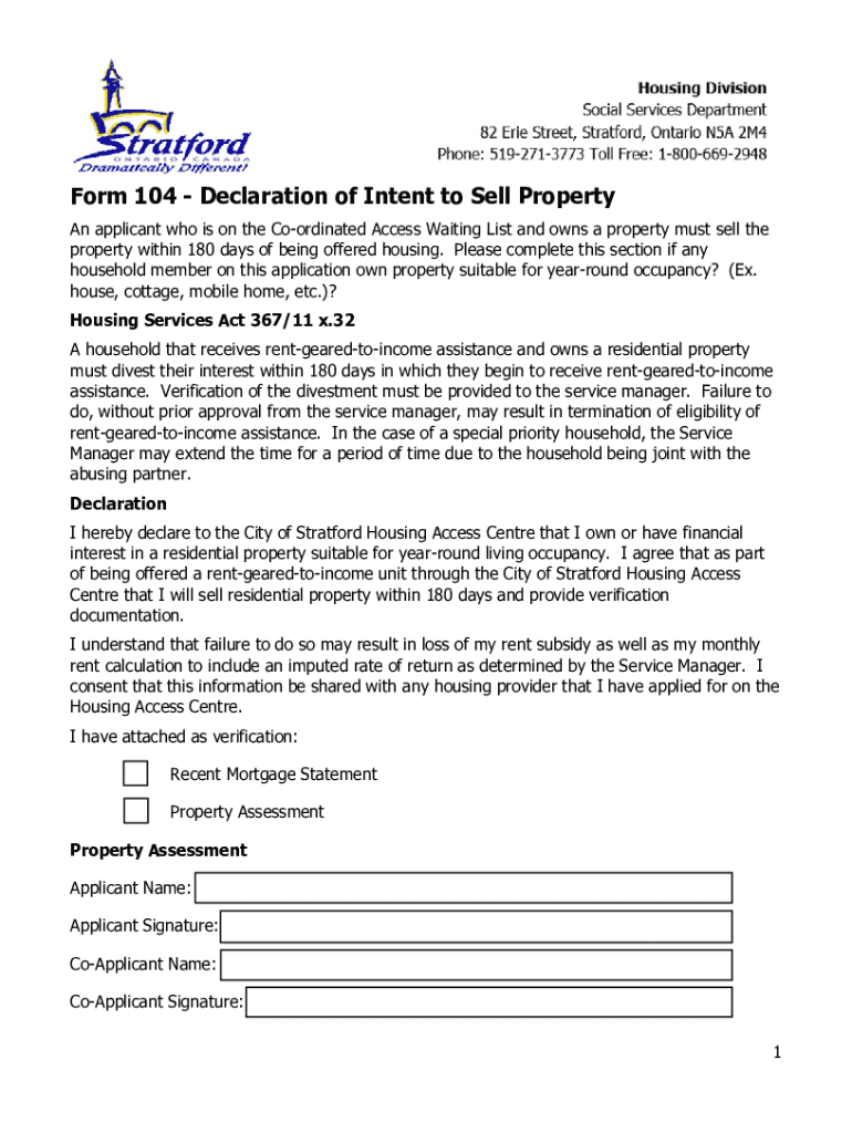 Form 104 Declaration of Intent to Sell Property An applicant who is on the Coordinated Access Waiting List and owns a property must sell the property within 180 days of being offered housing. Please