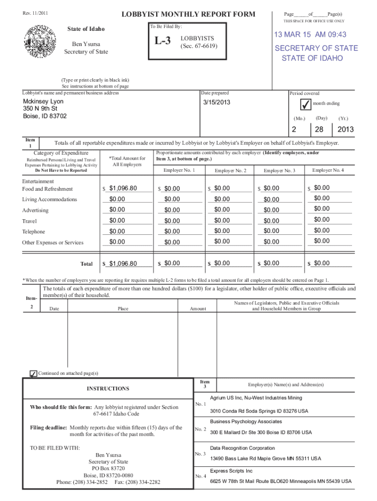 Rev. 11/2011LOBBYIST MONTHLY REPORT FORMPage___of___Page(s) THIS SPACE FOR OFFICE USE ONLYTo Be Filed By:State of IdahoL3Ben Ysursa Secretary of State13 MAR 15 AM 09:43LOBBYISTS (Sec. 676619)(Type