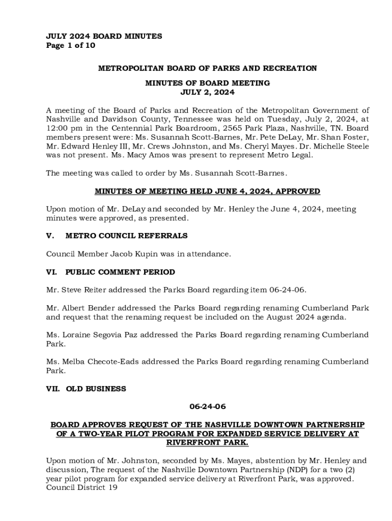 JULY 2024 BOARD MINUTES Page 1 of 10 METROPOLITAN BOARD OF PARKS AND RECREATION MINUTES OF BOARD MEETING JULY 2, 2024 A meeting of the Board of Parks and Recreation of the Metropolitan Government