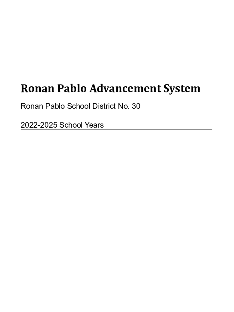 This document outlines the Ronan Pablo Advancement System (RPAS) which serves as a framework for evaluating the performance of educators within the Ronan Pablo School District No. 30. It includes detailed procedures for both Accountability and Advancement strands, which facilitate professional growth, evaluation of teaching effectiveness, and opportunities for salary advancement based on educational credits and professional service.