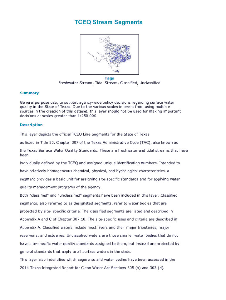 TCEQ Stream SegmentsTags Freshwater Stream, Tidal Stream, Classified, Unclassified Summary General purpose use; to support agencywide policy decisions regarding surface water quality in the State