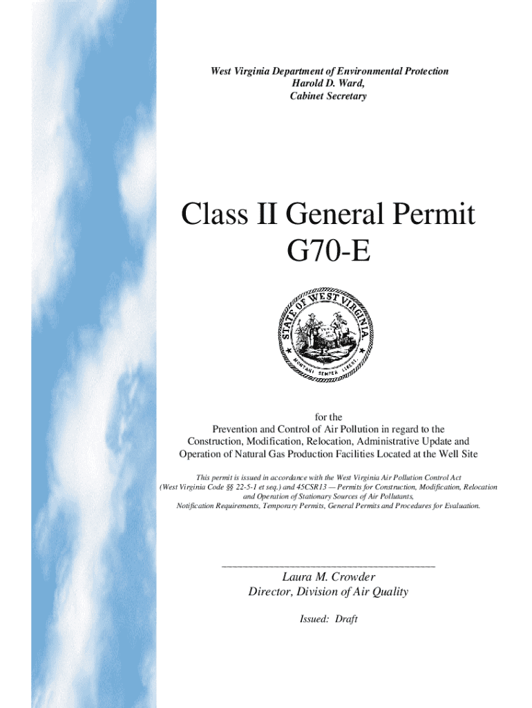 This permit is issued by the West Virginia Department of Environmental Protection and regulates the construction, operation, modification, and maintenance of natural gas production facilities located at well sites. It includes compliance requirements for air pollution control, emission limits, monitoring, and reporting to ensure protection of air quality in accordance with state and federal regulations.