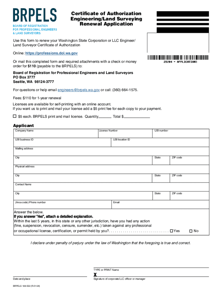 This form is used to renew your Washington State Corporation or LLC Engineer/Land Surveyor Certificate of Authorization. It requires the applicant to provide company information, license details, and contact information, along with payment instructions for the renewal fee.