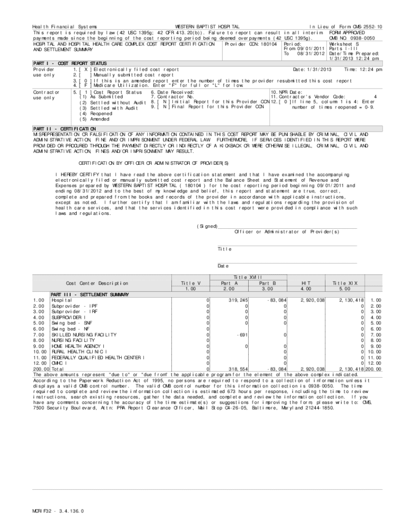 Health Financial Systems WESTERN BAPTIST HOSPITAL This report is required by law (42 USC 1395g; 42 CFR 413.20(b)). Falure to report can result payments made since the beginning of the cost reporting period being deemed overpayments (42 HOSPITAL AND HOSPITAL HEALTH CARE COMPLEX COST REPORT CERTIFICATION Provider CCN: 180104 AND SETTLEMENT SUMMARYIn Lieu of Form CMS255210 in all interim FORM APPROVED USC 1395g). OMB NO. 09380050 Period: Worksheet S From 09/01/2011 Parts IIII To 08/31/2012...