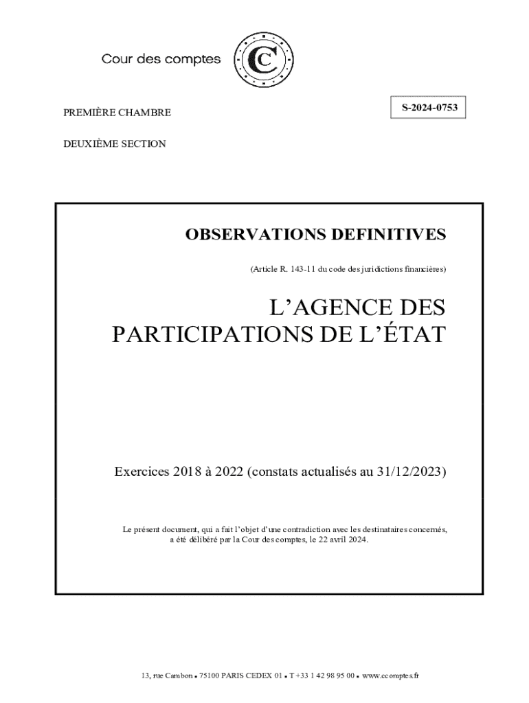 PREMIRE CHAMBRES20240753DEUXIME SECTIONOBSERVATIONS DEFINITIVES (Article R. 14311 du code des juridictions financires)LAGENCE DES PARTICIPATIONS DE LTATExercices 2018 2022 (constats actualiss au 31/12/2023)Le