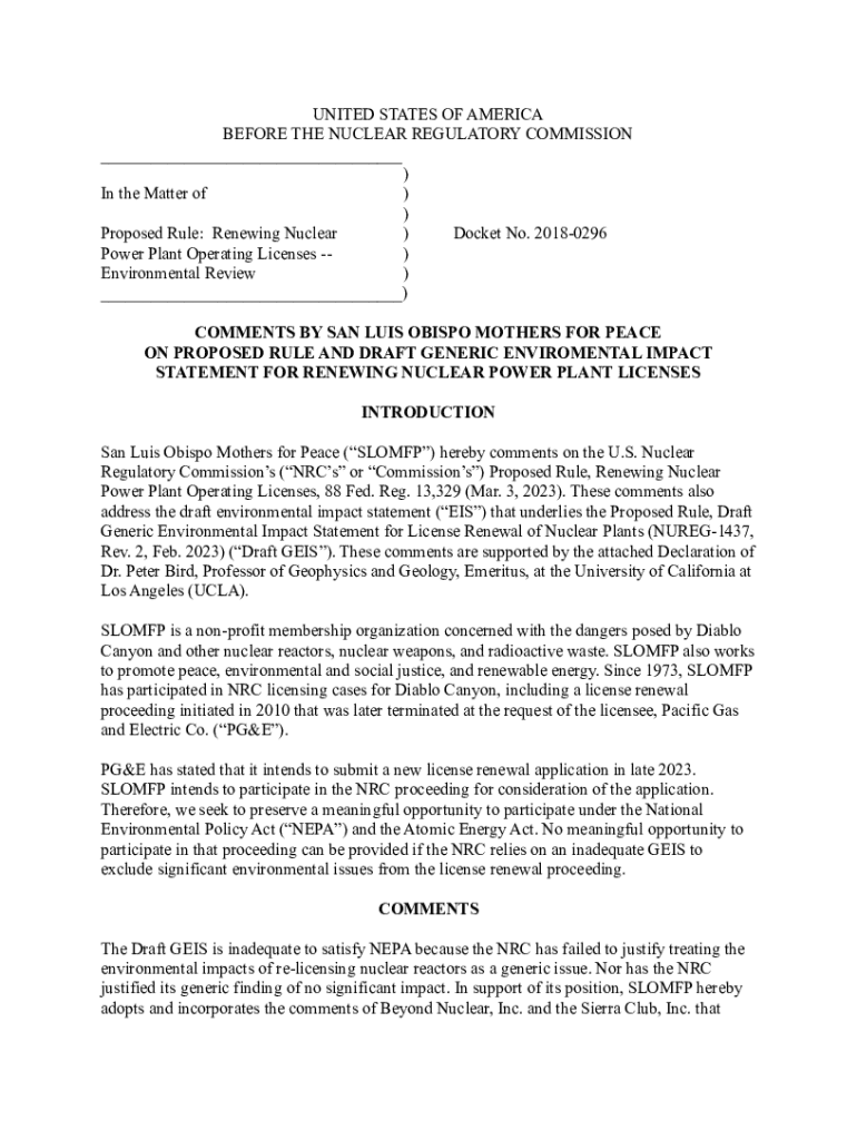 UNITED STATES OF AMERICA BEFORE THE NUCLEAR REGULATORY COMMISSION ___ ) In the Matter of ) ) Proposed Rule: Renewing Nuclear ) Docket No. 20180296 Power Plant Operating Licenses ) Environmental Review