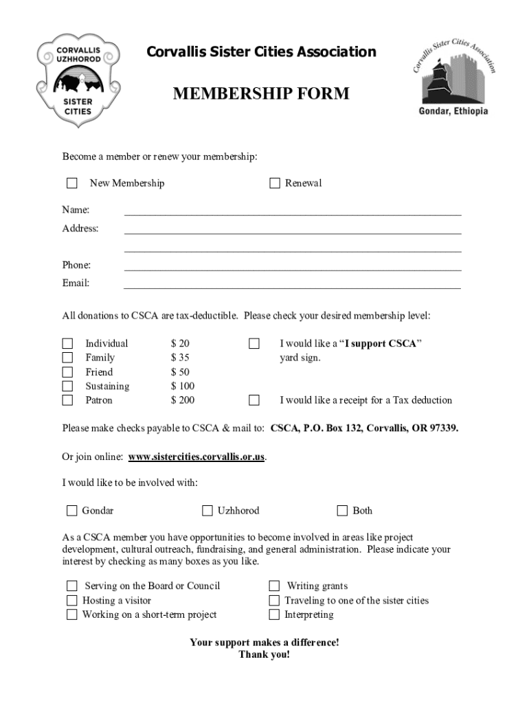 Corvallis Sister Cities AssociationMEMBERSHIP FORMBecome a member or renew your membership: New Membershipcc RenewalName:___Address:___ ___Phone:___Email:___All donations to CSCA are taxdeductible.