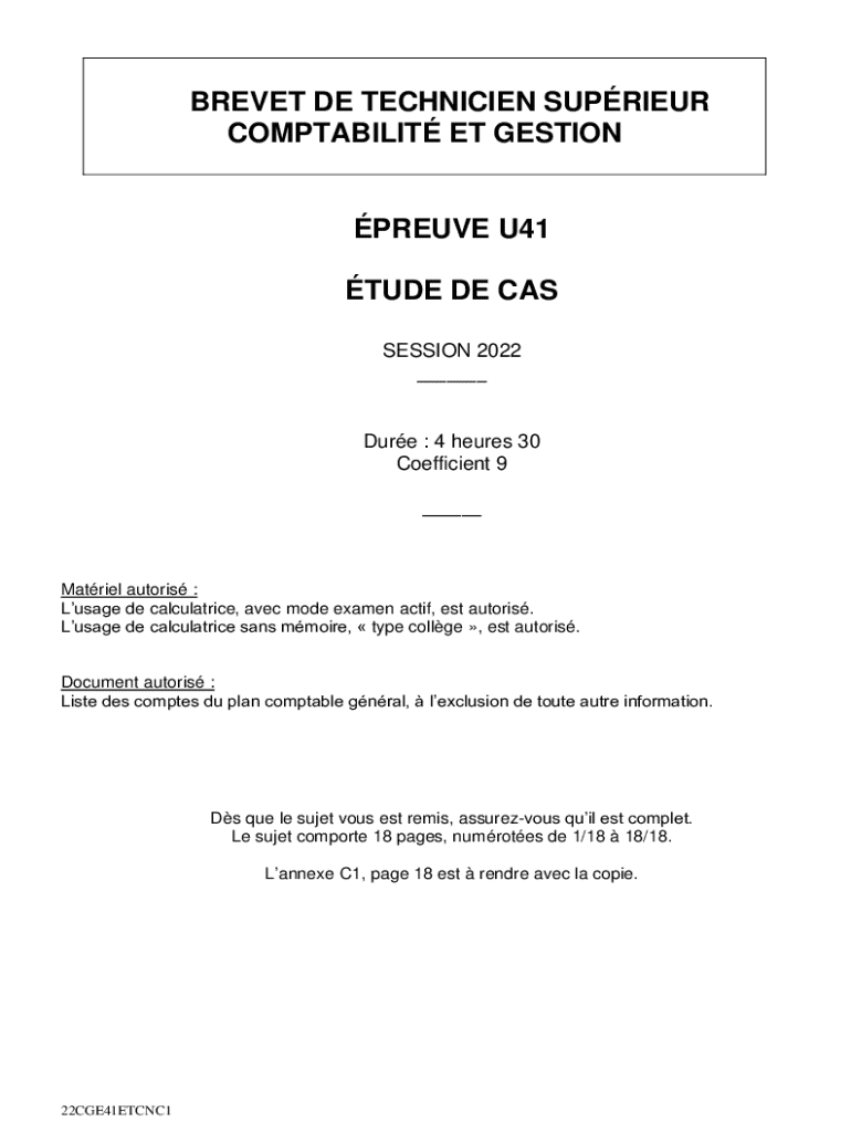 BREVET DE TECHNICIEN SUPRIEUR COMPTABILIT ET GESTIONPREUVE U41 TUDE DE CAS SESSION 2022 ___Dure : 4 heures 30 Coefficient 9 ___Matriel autoris : Lusage de calculatrice, avec mode examen actif, est
