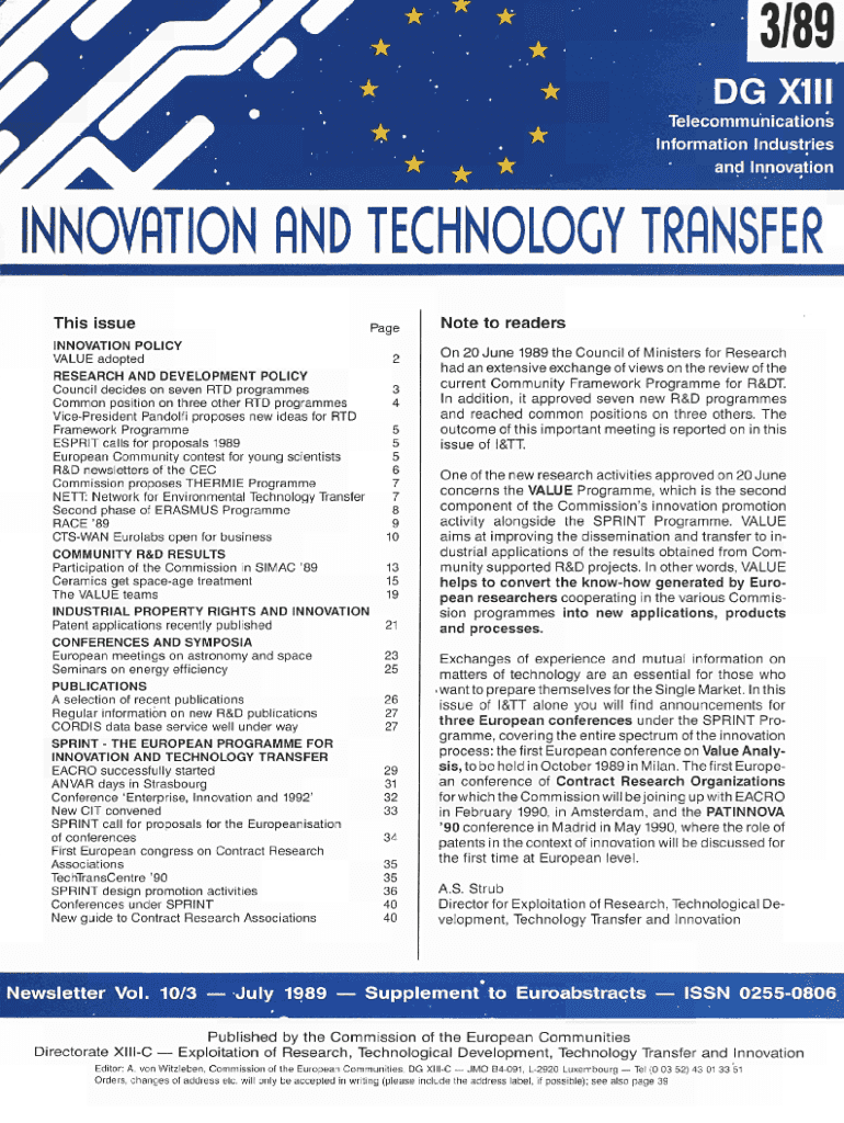 This document provides insights into the innovation and technology transfer policies and programs of the European Community, detailing various research and development initiatives, conferences, and results in the field of telecommunications, environmental technology, and other industries. It covers the newly adopted VALUE Programme aimed at enhancing the dissemination and industrial application of research results, and highlights several sub-programmes and upcoming events relevant to...