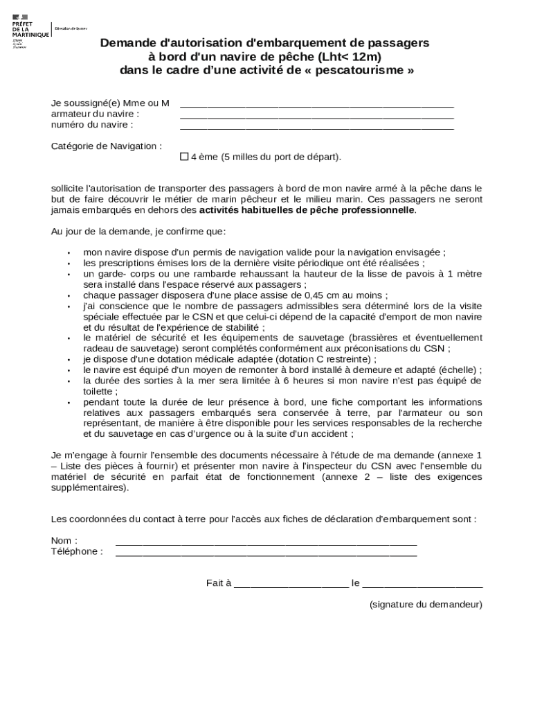Demande d\'autorisation d\'embarquement de passagers bord d\'un navire de pche (Lht 12m) dans le cadre dune activit de pescatourisme Je soussign(e) Mme ou M armateur du navire : numro du navire :___