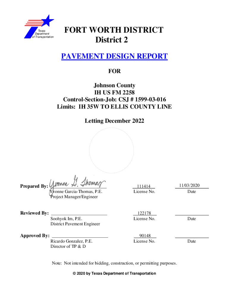 Texas Department of TransportationFORT WORTH DISTRICT District 2 PAVEMENT DESIGN REPORT FOR Johnson County IH US FM 2258 ControlSectionJob: CSJ # 159903016 Limits: IH 35W TO ELLIS COUNTY LINE Letting