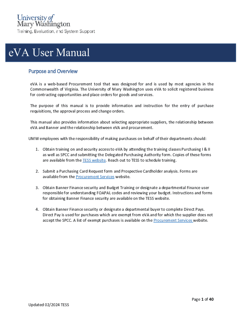 This manual provides essential information and instructions for using the eVA web-based procurement tool, which is employed by various agencies in the Commonwealth of Virginia, including the University of Mary Washington. It covers topics such as the entry of purchase requisitions, approval processes, supplier selection, and the relationship with Banner for finance management.