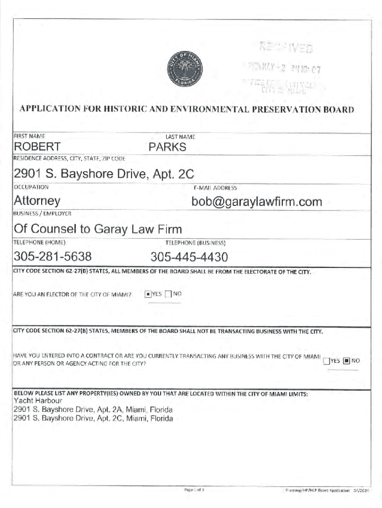 This document is an application form for individuals seeking to become members of the Historic and Environmental Preservation Board in the City of Miami. It gathers personal information, professional background, and confirms eligibility based on city codes governing board member qualifications.