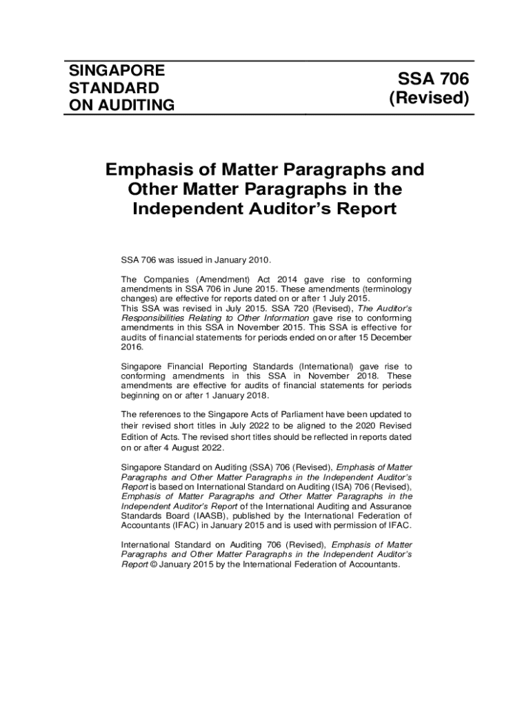 SINGAPORE STANDARD ON AUDITINGSSA 706 (Revised)Emphasis of Matter Paragraphs and Other Matter Paragraphs in the Independent Auditors Report SSA 706 was issued in January 2010. The Companies (Amendment)