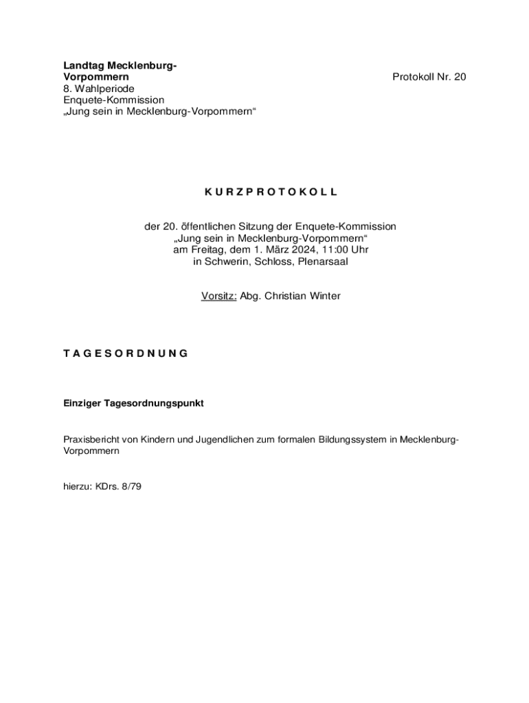Landtag MecklenburgVorpommern 8. Wahlperiode EnqueteKommission Jung sein in MecklenburgVorpommernProtokoll Nr. 20KURZPROTOKOLLder 20. ffentlichen Sitzung der EnqueteKommission Jung sein in MecklenburgVorpommern