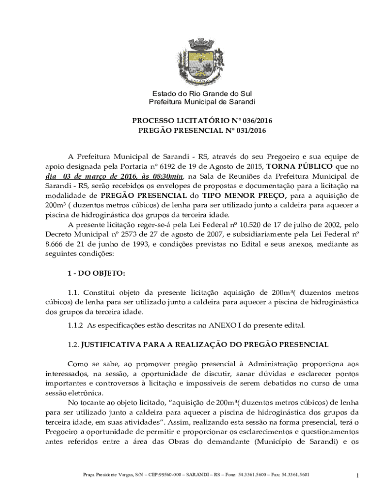 Estado do Rio Grande do Sul Prefeitura Municipal de Sarandi PROCESSO LICITATRIO N 036/2016 PREGO PRESENCIAL N 031/2016 A Prefeitura Municipal de Sarandi RS, atravs do seu Pregoeiro e sua equipe de